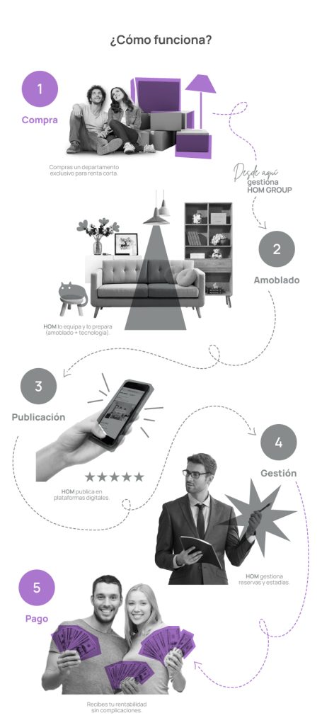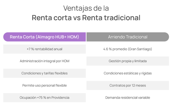 - Administración integral a través de HOM: amoblado, mantención y limpieza, gestión de reservas, atención a clientes y pagos.